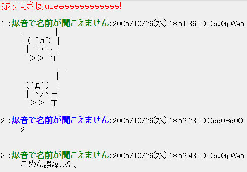 スレッドの名前は「振り向き厨uzeeeeeeeeeeeee!」。当時、音ゲー板にはクソスレ(スレッドを立てた意図が不明、内容が不適切なスレッドに対する蔑称)が乱立しており、この「振り向き厨uzeeeeeeeeeeeee!」スレッドもそのようなクソスレの1つであると思われていた。