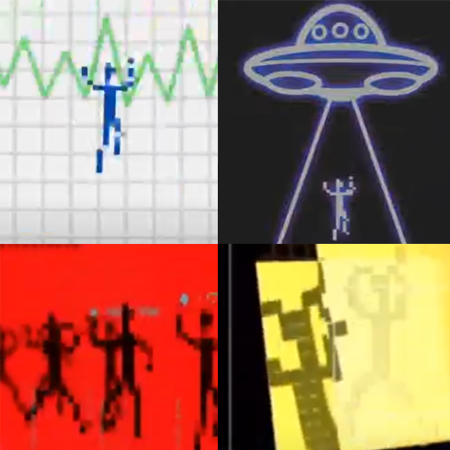 最初に投稿された内容は上の画像のように、何かの筐体で遊んでいる人がこっちを見る2コマのアスキーアート(文字で表現された絵)だった。