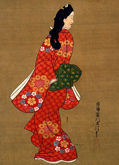 菱川師宣作「見返り美人図」。江戸初期に描かれた浮世絵である。静止画でありながら動きを感じさせる表現、女性の表情・着物の帯や柄を一枚の絵に収める表現手法が特徴的である。