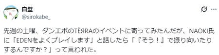 EDENを作曲した前田尚紀氏は、EDENにおけるネタとして「( ゚д゚ )彡そう!」を認知していた。当時は動画共有サイト「ニコニコ動画」の全盛期であり、EDENの動画のコメントが「( ゚д゚ )彡そう!」で埋め尽くされていたこともあり、広く認知されていたものと思われる。